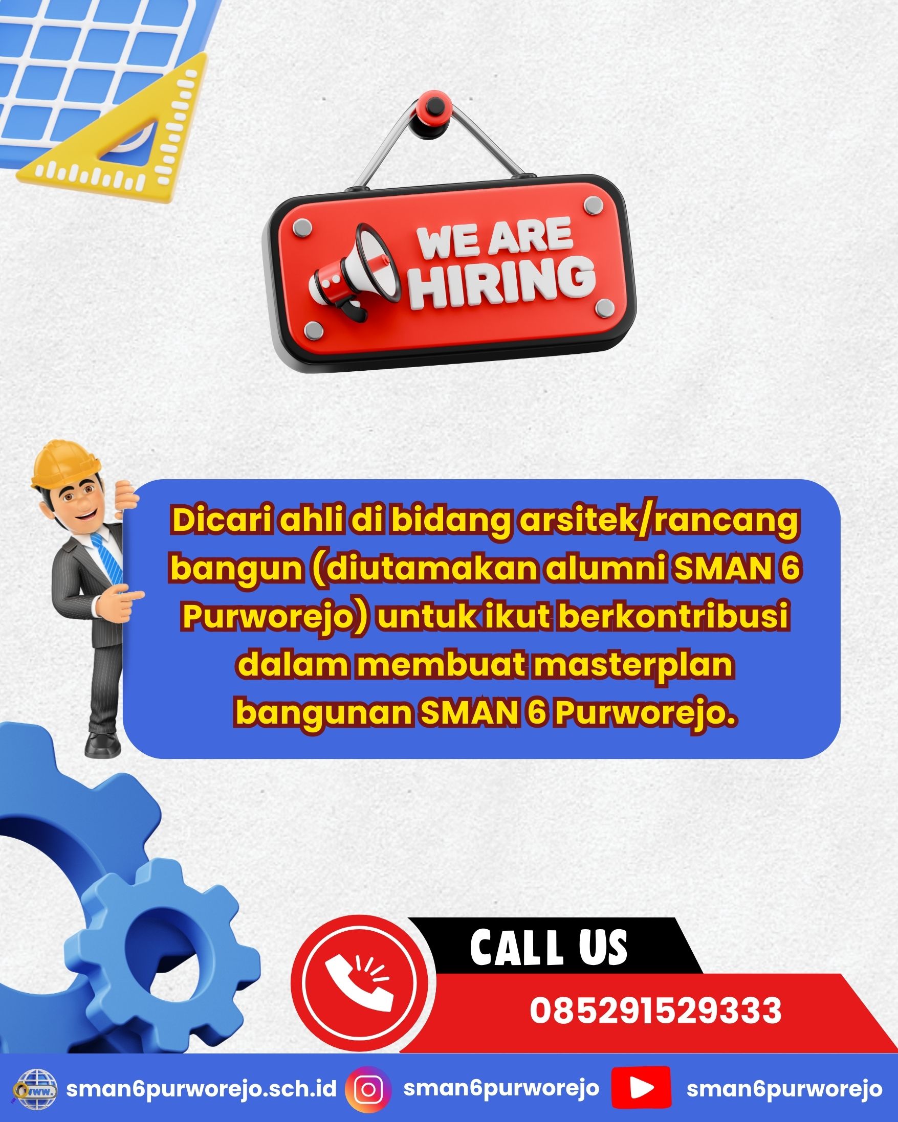 Dicari ahli di bidang arsitek/rancang bangun (diutamakan alumni SMAN 6 Purworejo) untuk ikut berkontribusi dalam membuat masterplan bangunan SMAN 6 Purworejo.